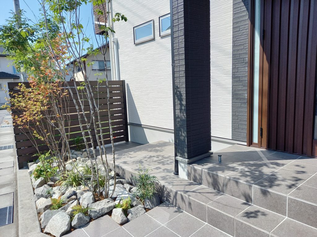 玄関ポーチもお庭へ向かう時も楽に移動できるように拡張し、同じタイルをつかった事で統一感がでました。