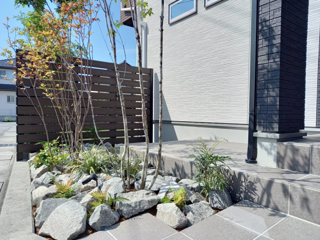 玄関の横の植栽スペースなので樹木が近くともスッキリとした印象を出したいと思い選びました。