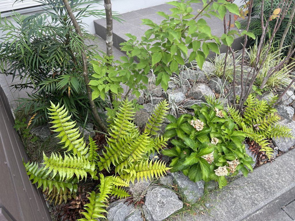 下草の中にはT様が育てられていたアジサイを入れ、玄関に彩を追加しました。