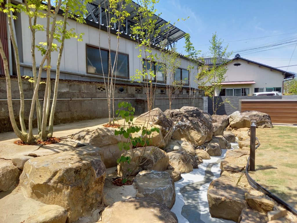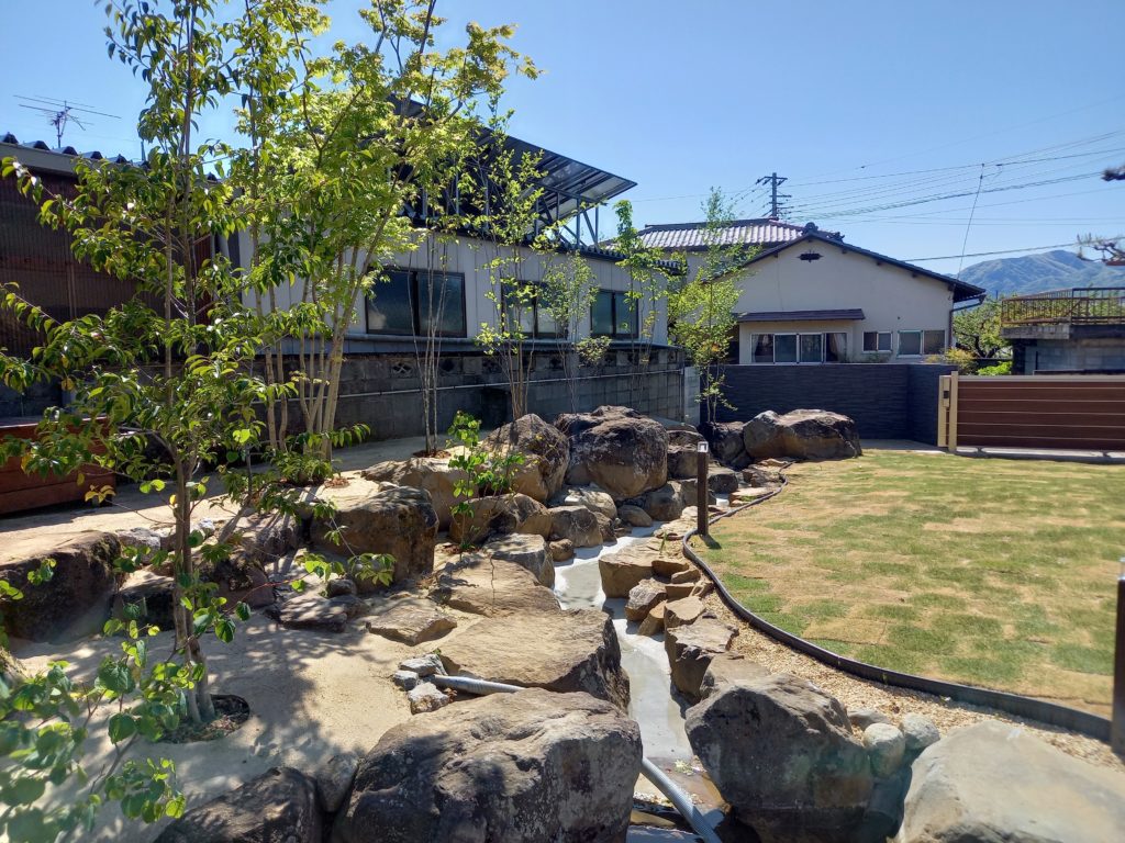 夜になれば、ライトアップされた雑木が水面に映り込み、昼間とは一味違う幻想的な表情を見せてくれます。 池、流れ、そして雑木。 自然の恵みを最大限に活かしたこの庭は、家族や友人が集い、心からくつろげる山梨市ならではの「特別な場所」となりました。