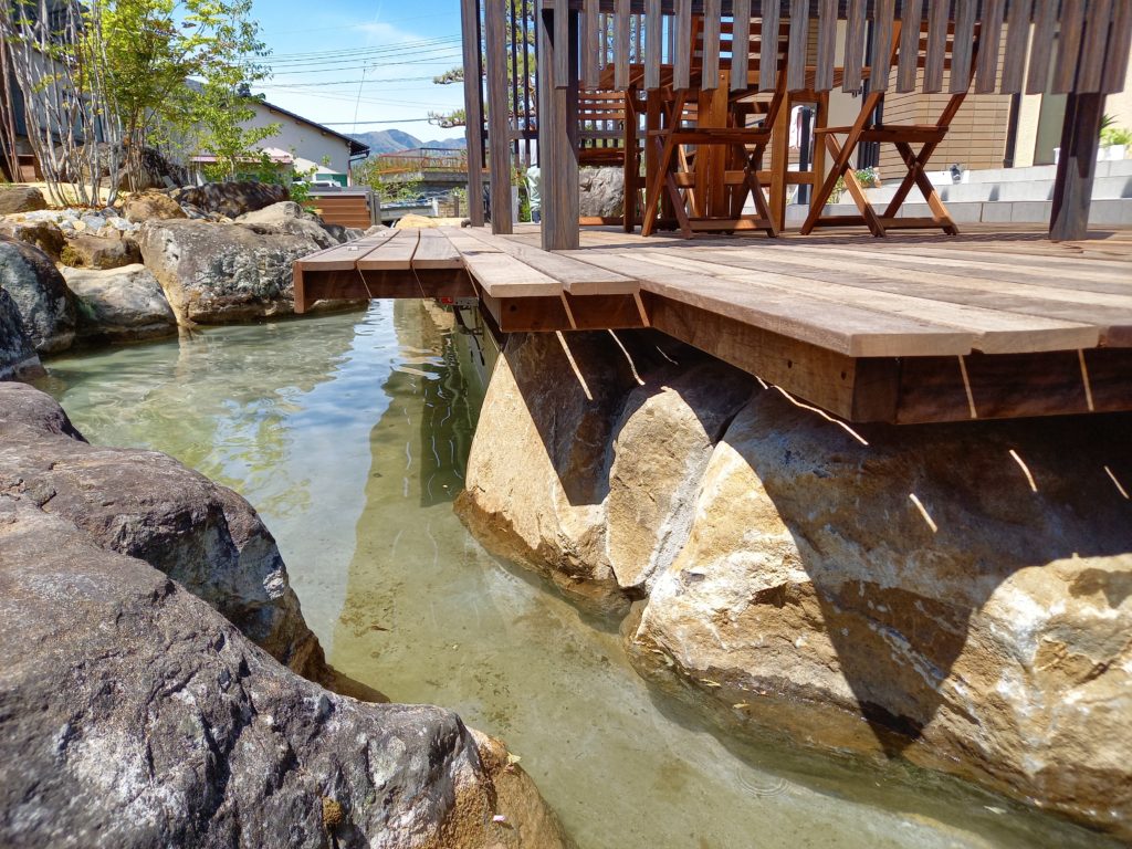 お庭の主役は、ダイナミックな巨石を贅沢に使った**「流れ」**のデザインです。 自然の岩肌を忠実に再現した石組みの間を、澄んだ水がゆったりと池に向かって流れます。 この「水」の動きと音が、五感を刺激し、深いリラックス効果をもたらしてくれます。