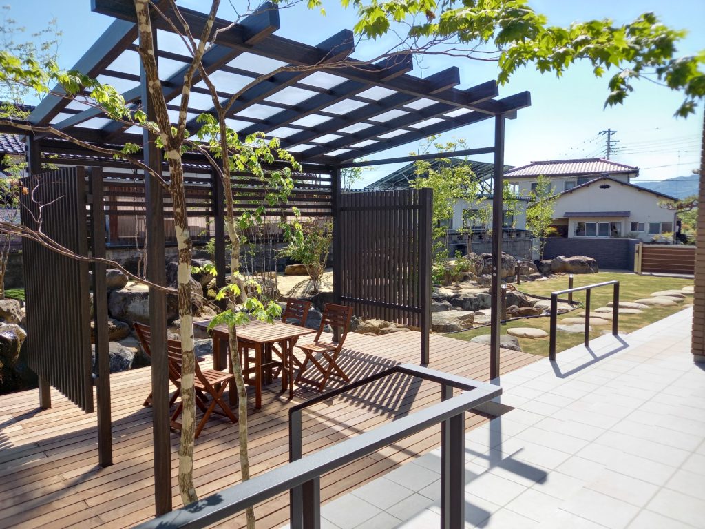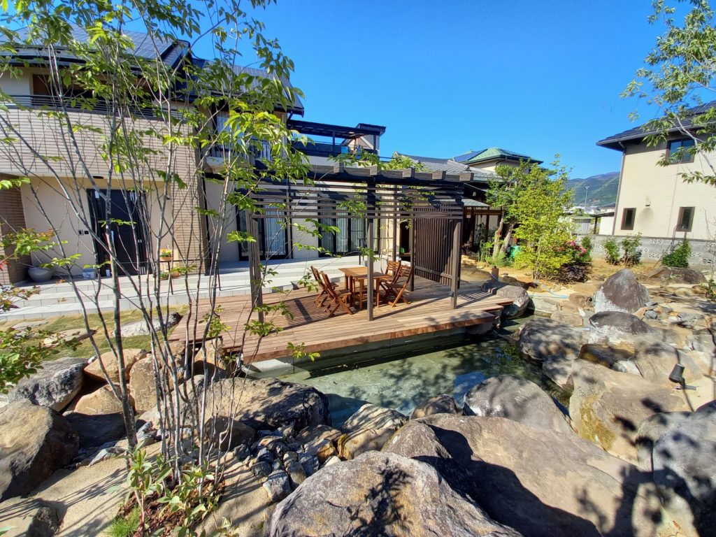 リビングの窓を開けると広がるのは、池の上に浮いているかのような開放的なウッドデッキです。 その上には、木目調の美しさが際立つ**タカショーの「Jポーチ」**を設置。 パーゴラ風のデザインが自然な日除けとなり、まるでリゾート地の水辺で過ごしているような、心地よい時間を日常に創り出します。
