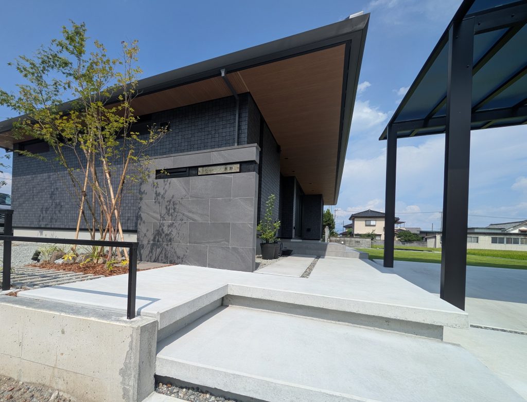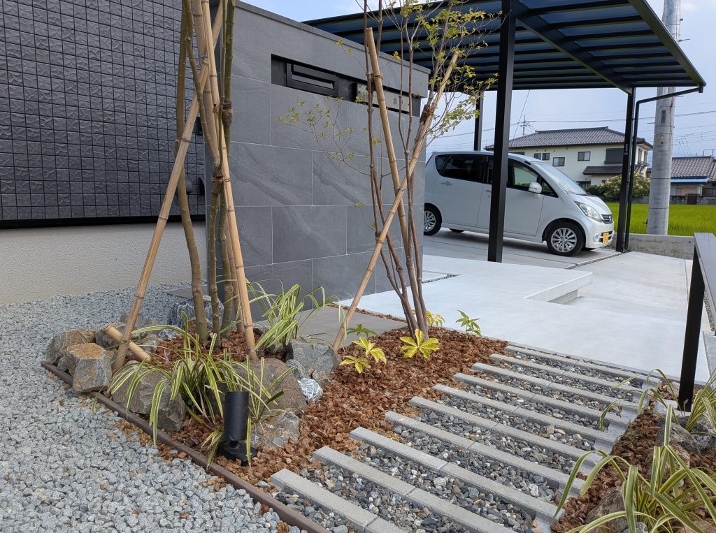 門袖の手前には、石と植栽でやわらかな景色を演出。無機質になりがちなモダン外構に自然素材を取り入れ、