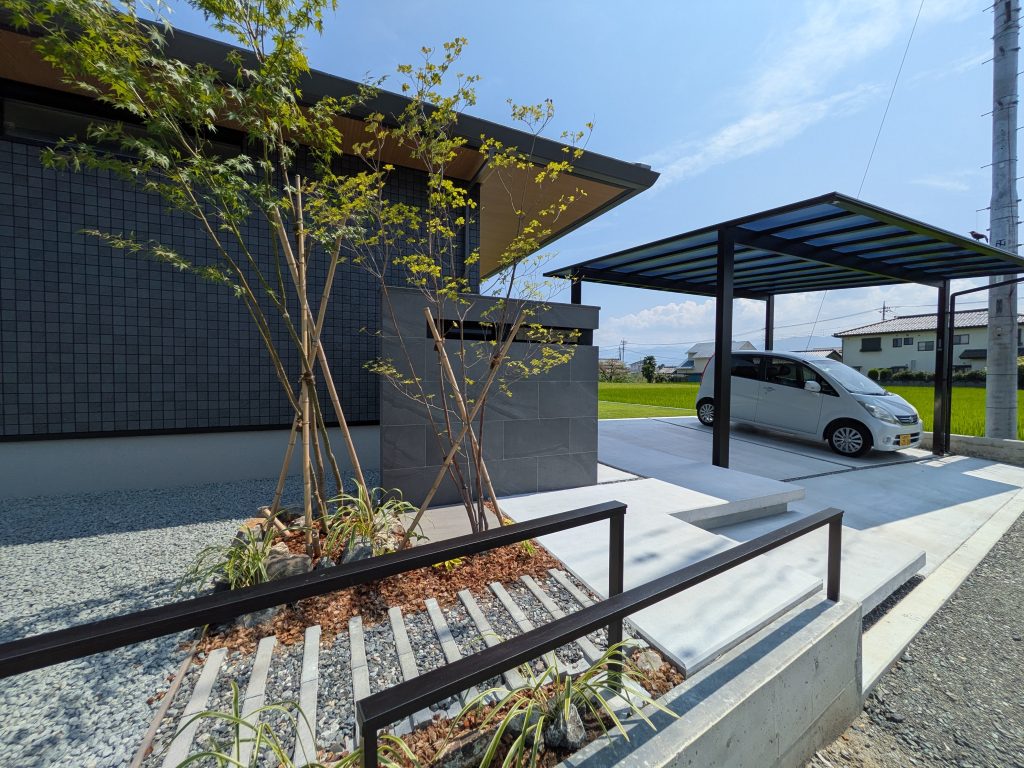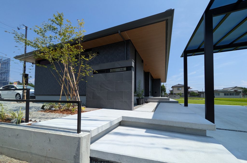 道路側から見ると、建築のシャープなラインと外構の直線構成が一体となります。