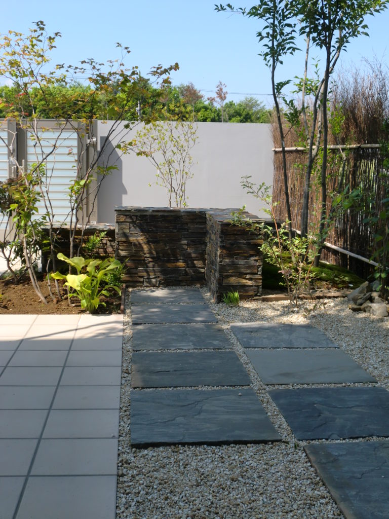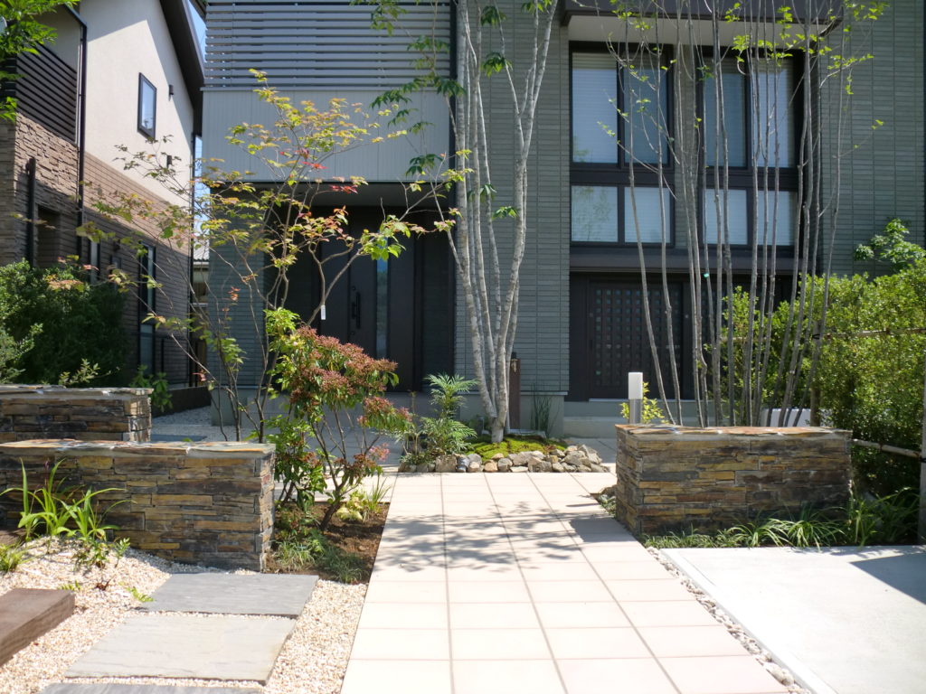 外構は自然素材の質感を活かした和モダンデザインで計画しました。