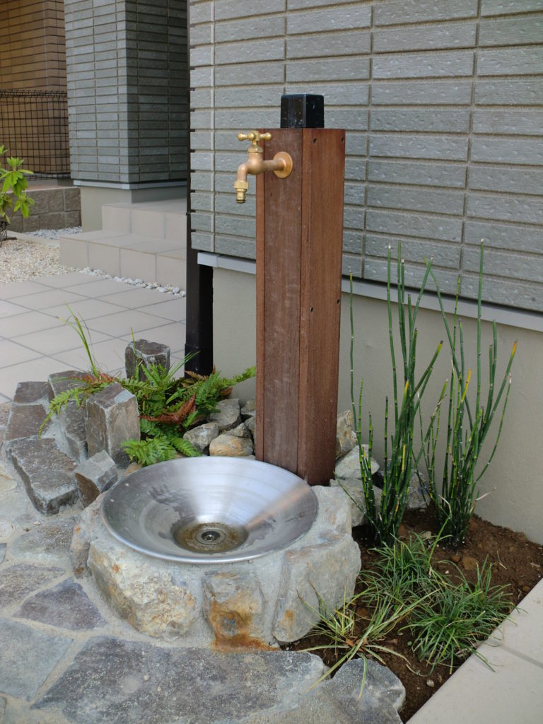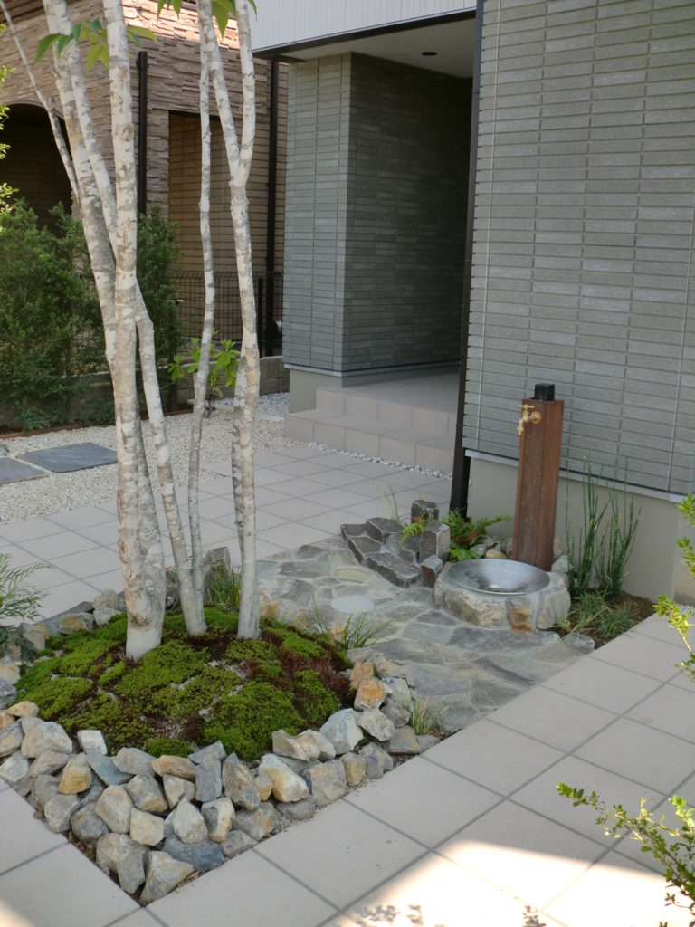 玄関前には自然石と苔を用いた景石スペースと手水鉢を設置。